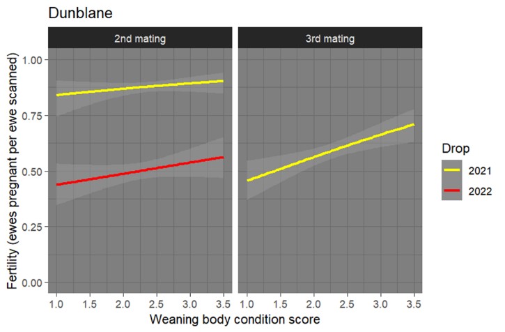 Figure 2 Weaning body condition score of the 2021 yellow tag and 2022 red tag ewes and their subsequent fertility rate (the number of pregnant ewes per ewe scanned). The light shading around the line of best fit is the confidence interval.