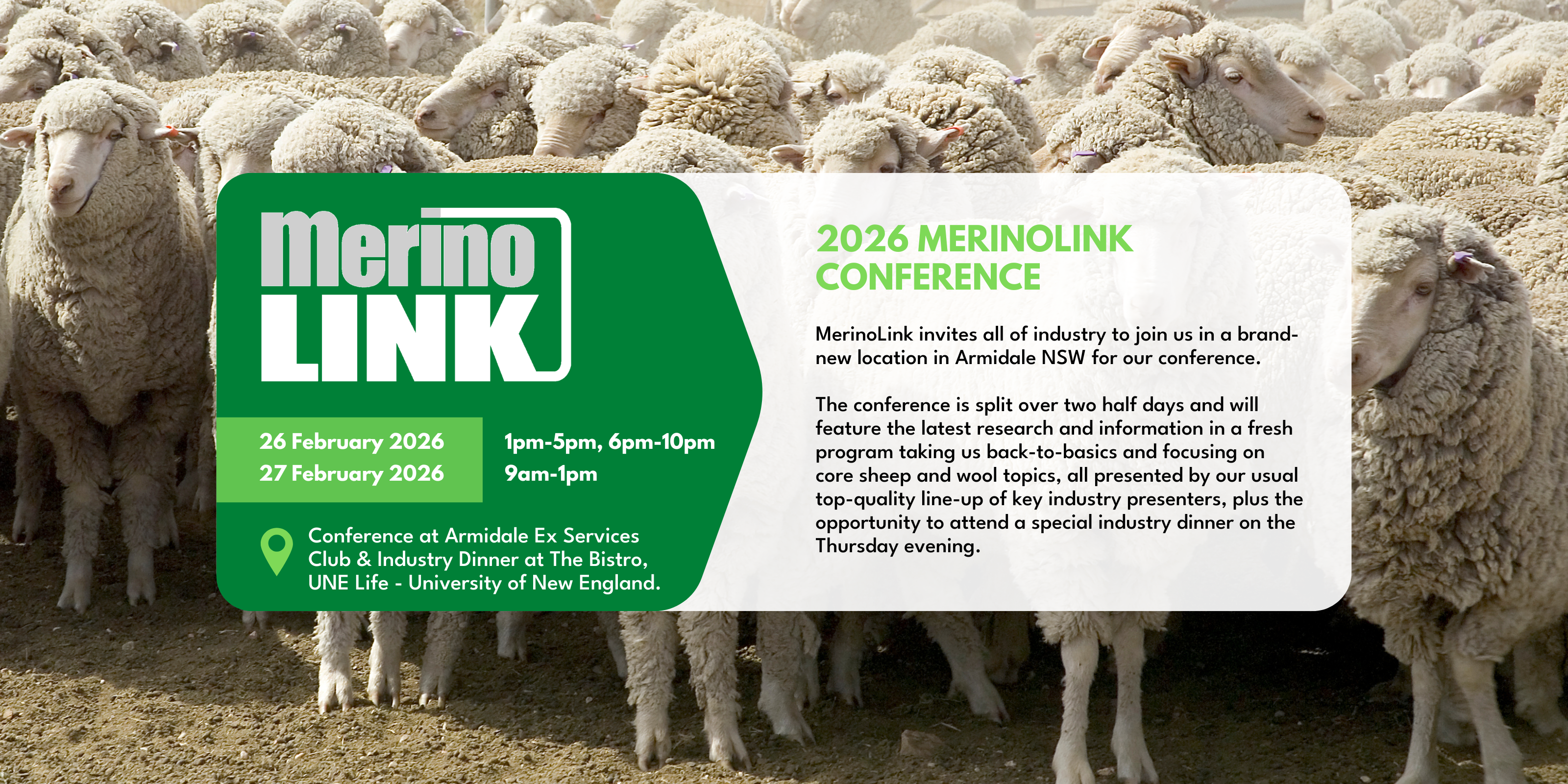 MerinoLink invites all of industry to join us in a brand-new location in Armidale NSW for our conference. The conference is split over two half days and will feature the latest research and information in a fresh program taking us back-to-basics and focusing on core sheep and wool topics, all presented by our usual top-quality line-up of key industry presenters, plus the opportunity to attend a special industry dinner on the middle evening.