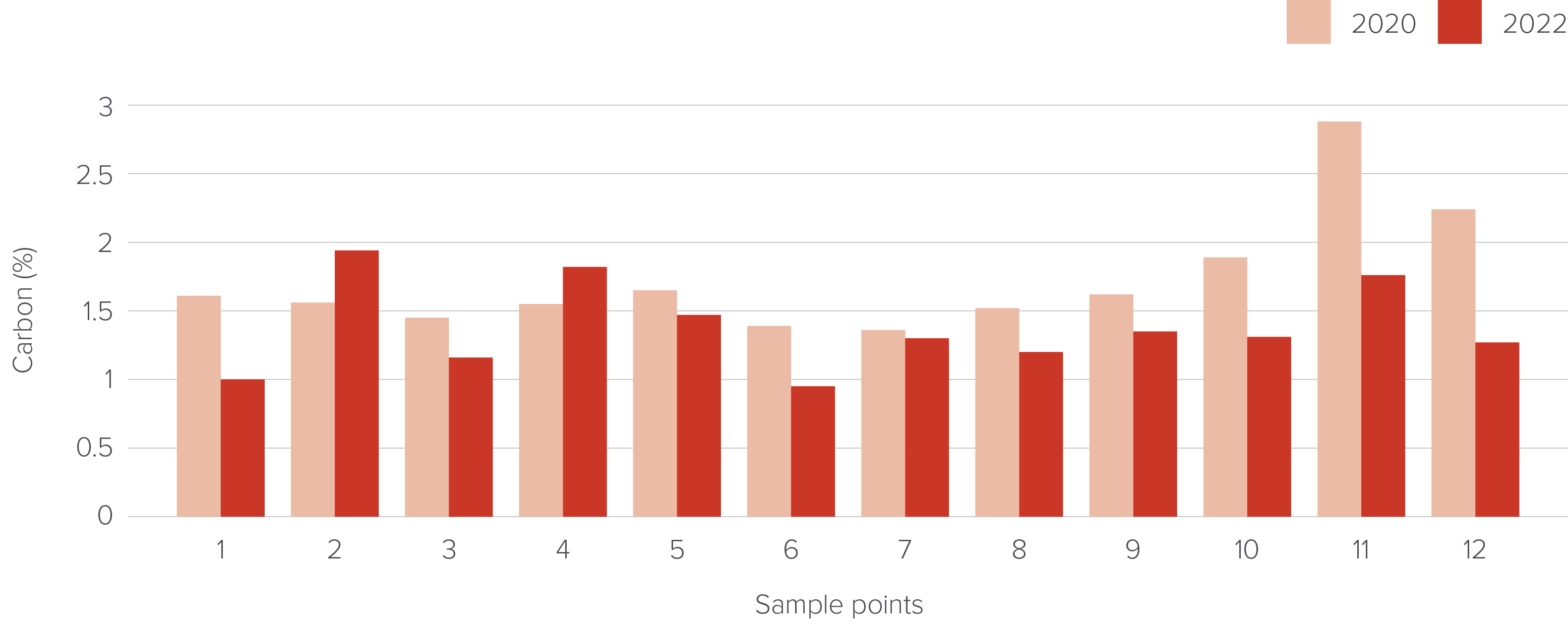 The graph shows the variability of carbon levels across Glenview – ranging from 0.95% to 1.94% – as well as a 0.3% drop of overall carbon levels from 2020 to 2022.